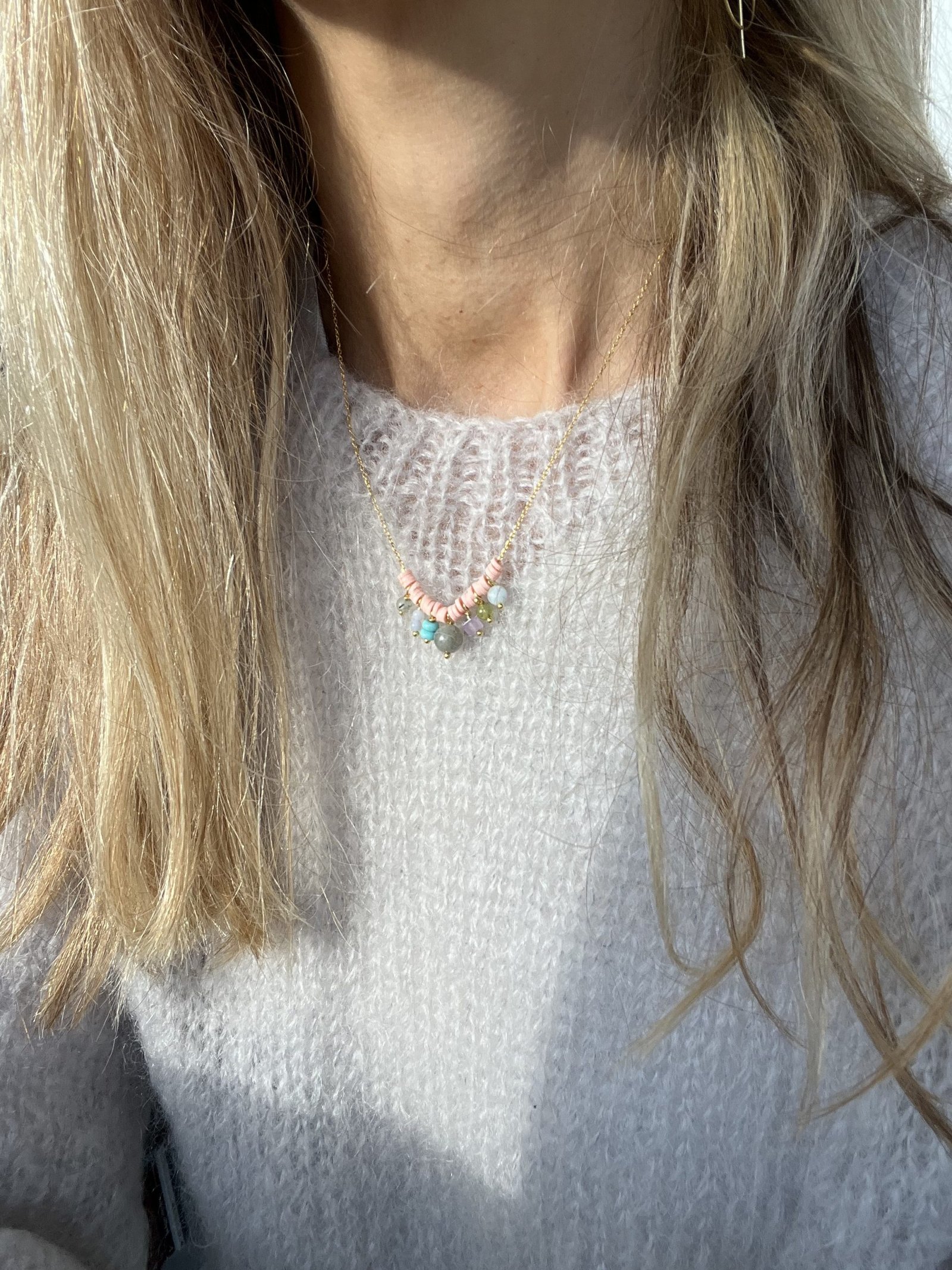 Collar con minerales varios y cadena de plata y baño de oro de 50 cm.