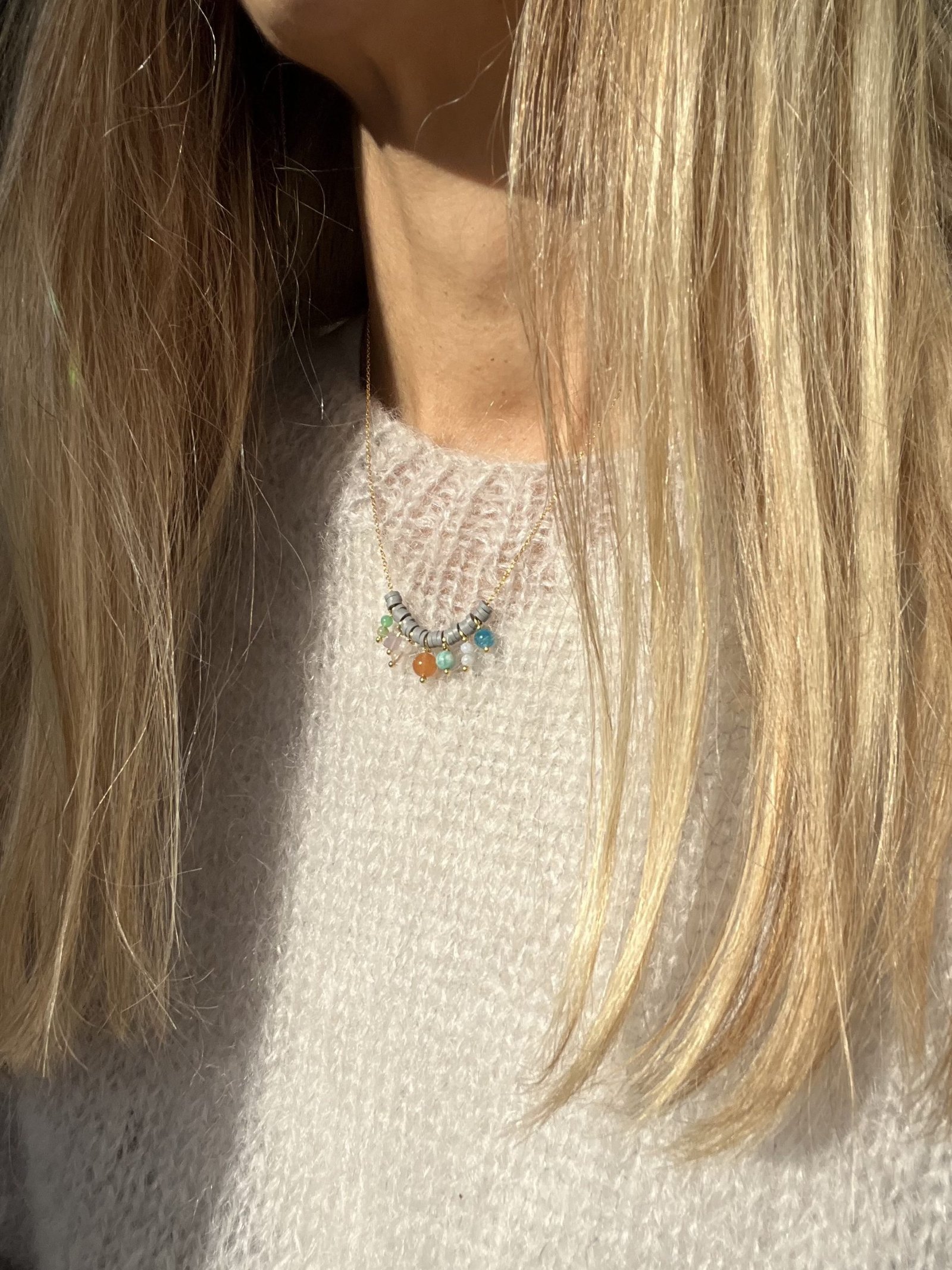 Collar con minerales varios y cadena de plata y baño de oro de 50 cm.